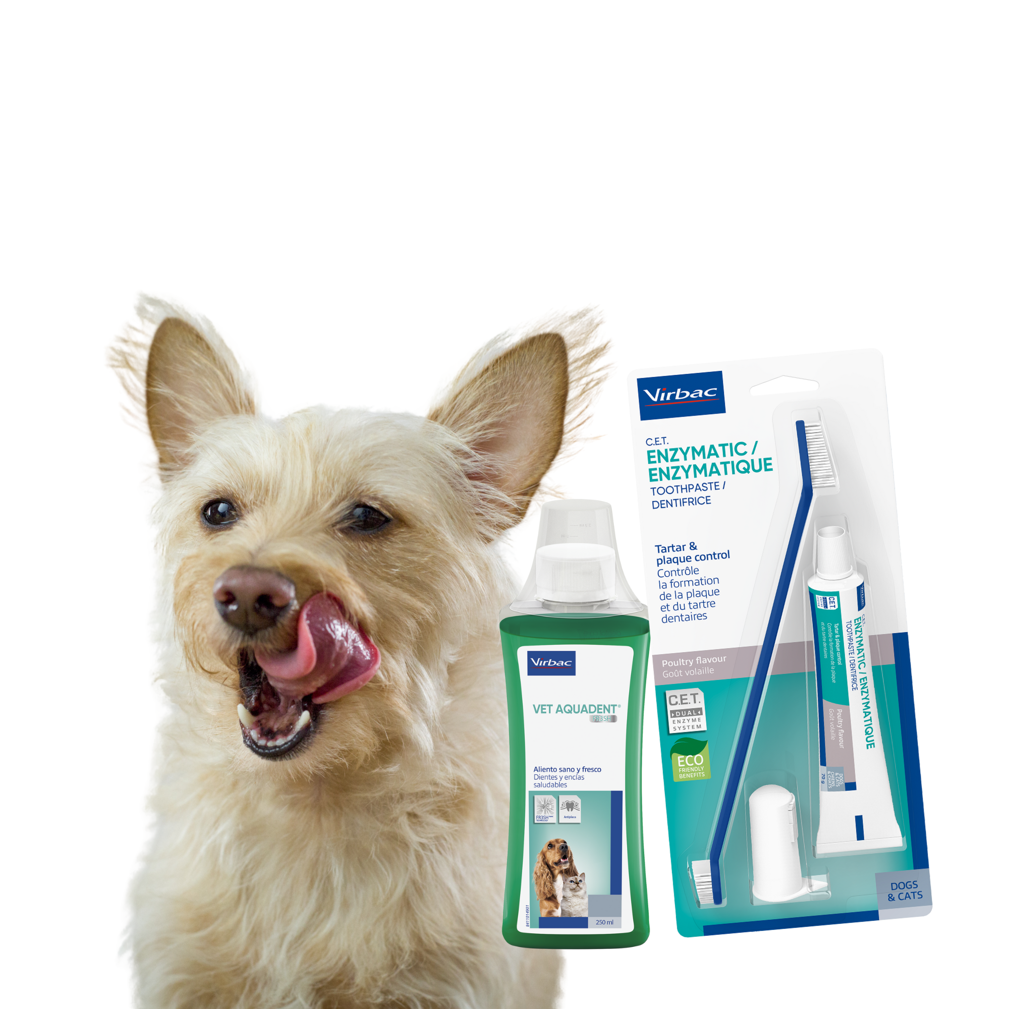 Cuida la salud bucal de tu mascota con este pack completo de higiene dental, ideal para prevenir la placa, el sarro y combatir el mal aliento de forma efectiva y sencilla. Incluye dos productos complementarios de uso diario: pasta dentífrica enzimática C.E.T. y solución oral Vet Aquadent FR3SH.